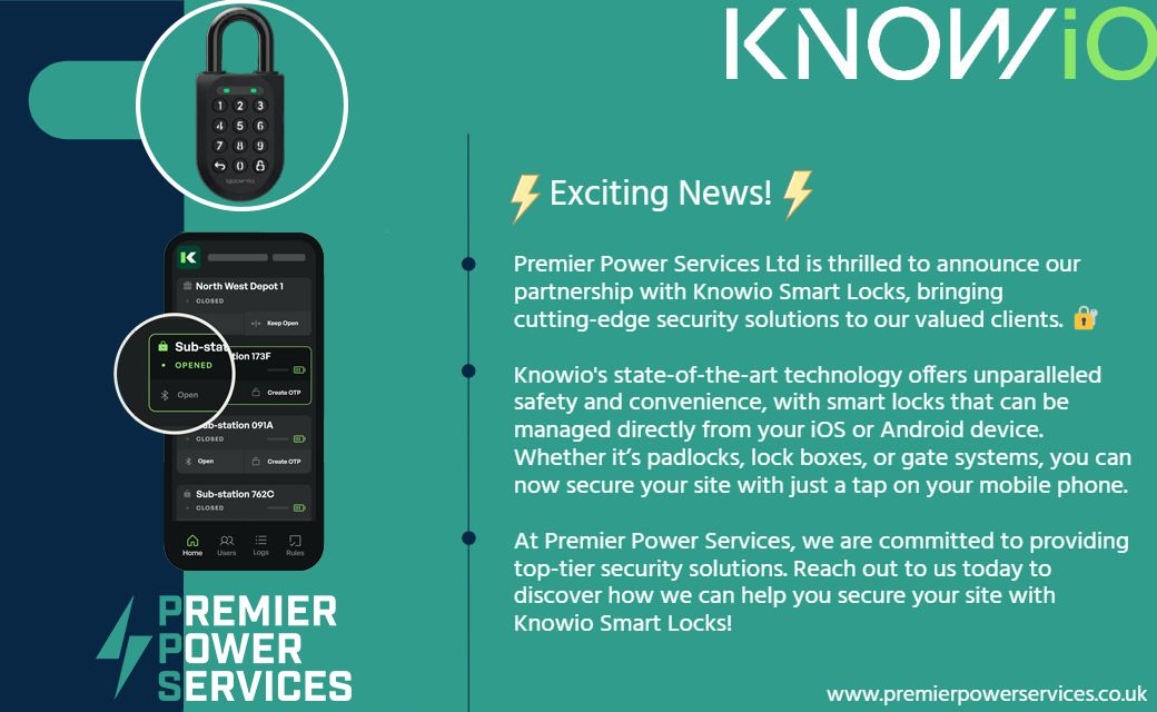 Premier Power Services is thrilled to announce our partnership with Inniovate and their Knowio app. Their Smart locks and IoT Sensors will bring cutting-edge security solutions to our valued clients. Knowio’s state-of-the-art technology offers unparalleled safety and convenience, with smart locks that can be managed directly from your iOS or Android device, or from their desktop portal. Whether it’s padlocks, lock boxes, or electric gate systems, you can now always guarantee access to your site with just a tap on your mobile phone, and always know who can access and who has accessed any given site.